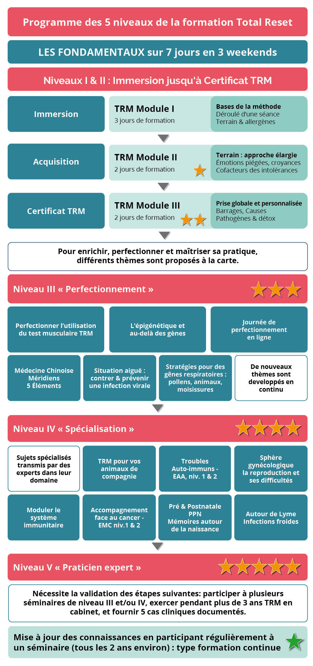 Discover our Total Reset training pathway, specifically designed for practitioners wishing to develop their skills in supporting people experiencing allergies, intolerances, hypersensitivities and chronic everyday discomforts. Our practical modules, ranging from core foundations to advanced specialisation, enable you to acquire a new well-being approach efficiently and confidently, enriching your professional practice with additional skills.